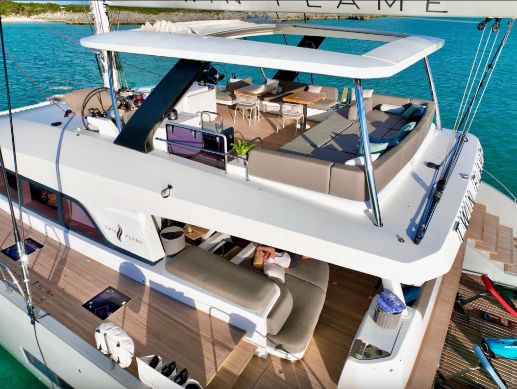 Some mornings begin here with coffee and quiet conversation as the sea wakes up around you. Later in the day, the space naturally shifts into a social setting, shared meals around open-air dining tables, laughter carried on warm trade winds, and the ever-changing palette of blues surrounding the boat.